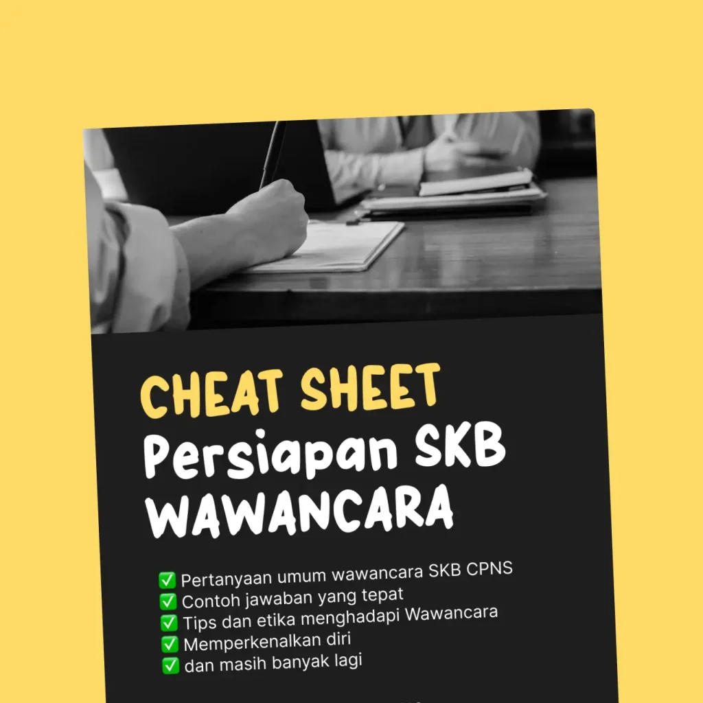 Untuk kamu yang SKB non-CAT ada sesi wawancara, Minka (kanalcasn) ada cheat sheet yang bisa bantu kamu memberikan gambaran wawancara SKB itu seperti apa sih. Jadi, di dalam cheat sheet ini nanti kamu akan lebih tau tentang: