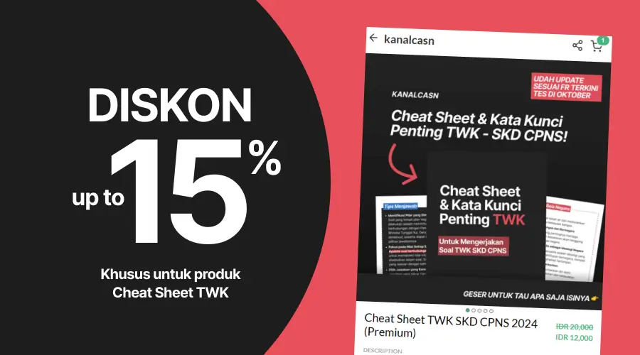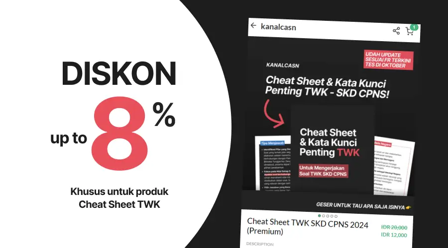 Tambahan diskon hinggal 8% hanya untuk produk Cheat Sheet TWK selama bulan Oktober 2024.